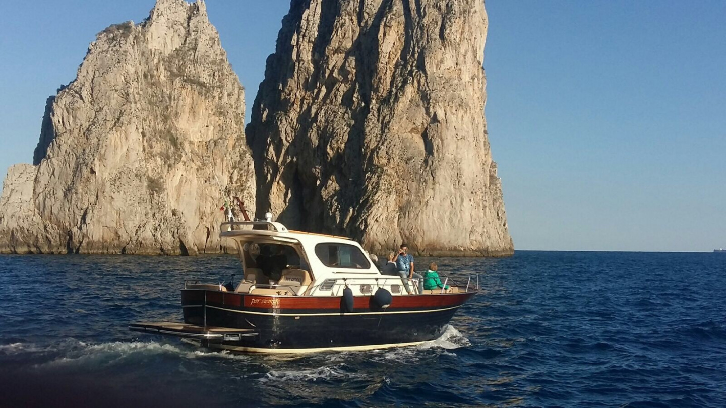 Our exclusive Capri tour starts from Sorrento penisular or Positano in Amalfi coast* and will take you along the Sorrento coastline to admire the natural beauties of Lands of Mermaids. Our English speaking skipper will explain the history of the area. Passing near the bright blue waters of Regina Giovanna beach (the Baths of Queen Joan) in Sorrento coast and natural waterfall in Massa Lubrense, you’ll arrive at the Island of Capri.